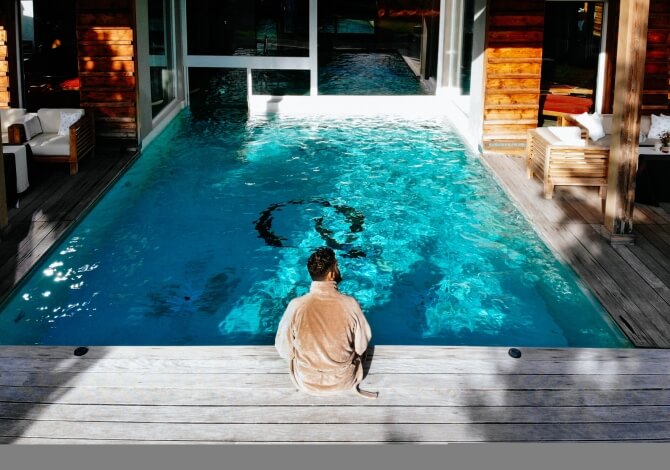 Due persone sedute sul bordo di una piscina, circondate da un deck di legno e un tetto di tegole arancioni.