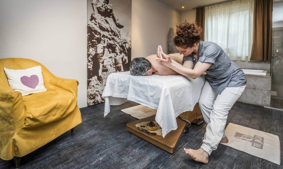 „Te Jaga“. You’re surely asking yourself why we chose to give our spa such an unusual name. We’ll tell you our secret: “Te Jaga” stands for the traditional hay beds of the Val di Fassa valley farmers. All of the exhaustion they felt after the long working days completely disappeared after a restorative night on one of these beds. Today we know that a “hay bath” promotes wellbeing. That is exactly the kind of wellbeing we want to offer you in the “Te Jaga” spa: We want to bring balance back to your life by finding a treatment that is individually tailored to your needs. This could be a massage, a special kind of sauna, a “Kneipp” treatment or maybe even a healing chromo- or aromatherapy.