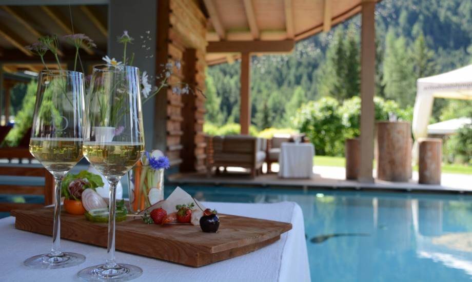Ogni giovedì l’aperitivo in giardino, a bordo piscina, per godersi i tramonti estivi, le meravigliose Dolomiti sorseggiando un bicchiere di Trento DOC e assaporando deliziosi finger food preparati dal nostro chef. La temperatura ideale per chiacchierare all’aria aperta comodamente seduti sui nostri divanetti.